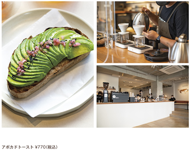 白を基調とした清潔な空間の店内に足を踏み入れると、奥のカウンター席では仕事をしたり、コーヒーを楽しむお客様が。そしてカウンター席の正面にはコーヒー豆の焙煎機が鎮座しています。自由が丘店同様に全国にあるロースターから、ブレンドされていないシングルオリジンの豆を厳選して仕入れている他、店内で焙煎機をシェアしているAOコーヒーによる自家焙煎されたコーヒーは、ハンドドリップやエアロプレスで一杯ずつ丁寧に淹れられます。